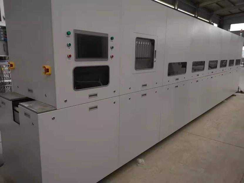 太阳能电池片退火光衰炉(ANF-LGP-1000 系列) 一、概述 1.1 产品型号: ANF-LGP-1000 1.2 产品功能: ◆新型退火抗光衰炉:采用高纯陶瓷辊道传输电池片,特定波长的 LED 光源照射电池片。 ◆能耗低:辊式传输没有金属网带进出炉膛,耗能更低,单列耗能 25KW。 ◆效率高:单多晶 PERC 电池处理后,电池效率提升 0.05%。 ◆产量大 :典型辊速 9m/min,最大辊速达 15m/min,比链式炉产能提高 30%以上。 ◆长度短: 整机长度不足 8M,可节省安装空间、降低厂房造价。 ◆光衰小:采用特定光源照射电池片,电池光衰 0.8%~0.2%。 二、设备主要功能及结构 2.1 设备功能:实现对电池片的照射退火处理。 2.2 适用产品:单多晶 PERC 太阳能电池。 2.3 设备型号 ANF-LGP-1000 系列太阳电池退火光衰炉。 2.4 设备结构(常规 9M/MIN) ◆预热区:1 个,长度约 600mm;温度设定范围小于 500℃。 ◆辐照区:10 个,总长度约 5000mm。 ◆冷却区:1 个,长度约 1000。 2.5 流水线高度 流水线高度:960mm-1060mm 可调 2.6 传动系统1/ 3 ◆传动类型:炉腔内陶瓷辊道,其余金属辊道。 ◆速度范围:15m/min 以下任意可调。 ◆速度控制:变频器无级调速。 ◆传动方式:机械传动。 2.7 加热系统 ◆加热辐照元件:红外石英灯管和特定波长 LED 灯板;保温材料:高纯陶瓷纤维制品。 ◆控制方式:上位工控机、下位 PLC 智能 PID 控制,参数自整定; ◆控制温区:11 个。 ◆控温稳定度:±2℃; ◆温度均匀度:±2℃; ◆报警保护:断偶、超温、偏相等声光报警保护。 2.8 冷却系统 强制风冷,风速风压可调。 2.9 供气和排气系统 ◆CDA 进气:玻璃转子流量计控制,使用干洁的压缩空气。 2.10 电控系统 本烧结炉采用西门子控制系统:上位采用工业控制计算机监控,可以实现温度曲线存储、温度 控制、速度变频控制、气体压力检测、设备运行数据监测与记录、异常报警以及各控制参数修 改等功能,报警保护包括超温、断偶等。 下位温度控制采用西门子 PLC 控制,具有 PID 参数自整定功能,实现温度的自动控制。 计算机监控系统可主要实现如下功能: ◆温度采集与记录:便于质量管理和追踪。 ◆曲线存储与自动调出:客户可针对不同产品,设定多种使用曲线,并可随时调出使用。 ◆参数调整:包括温度、控制参数等下位机可调整的参数,均可在上位实现控制,并可扩展实 现与用户局域网的通讯和管理。 ◆温度曲线记录分析系统:定期测量分析炉膛温度及工件表面的实际温度曲线。 ◆设备安全:当外部条件不满足要求时,禁止开机